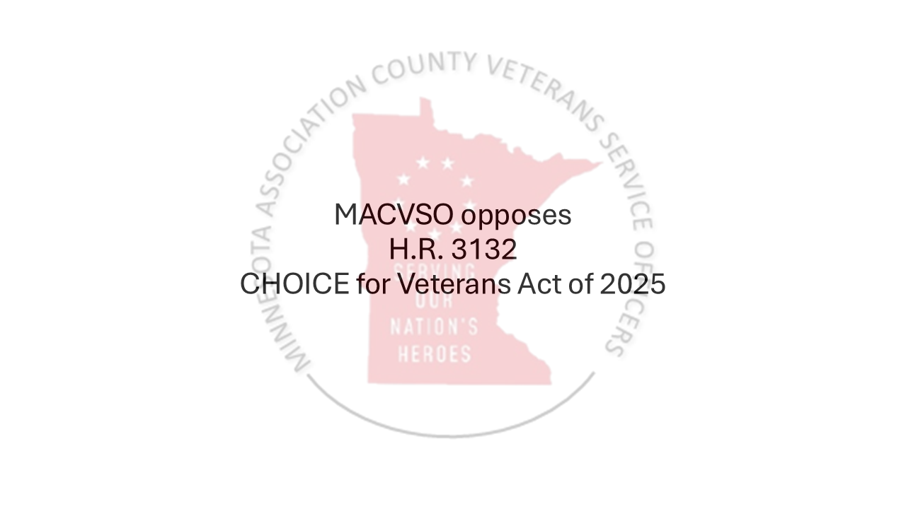 On behalf of the Minnesota Association of County Veterans Service Officers (MACVSO), we strongly oppose H.R. 3132, the CHOICE for Veterans Act of 2025, which we believe would enable predatory “claim shark” practices and weaken critical protections for veterans.